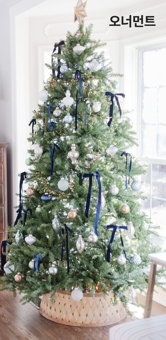 첫째는, 클래식으로 첫 번째 사진에서 보시는 바와 같이 사선형으로 끊지 않고 연결하는 방식입니다. 아마 백화점이나 길 위의 대형 트리를 오너먼트로만 장식하기 힘들어 리본으로 두른 것처럼 표현한 모양을 많이 보셨을 거예요. 이 데코 방식의 팁은 리본을 위에서부터 시작하여 두르거나 중간중간 나뭇가지 사이에 꽂아 주거나 하면 됩니다. 깊은 느낌을 내기 위해서는 다른 질감이나 색의 리본을 선택하는 게 좋아요. 리본은 보통 선물 포장하는 리본들보다는 넓이가 두꺼운 리본을 선택하는 게 보통입니다.