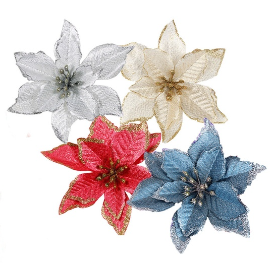 보통 꽃은 흔히 보시는 포인세티아 조화가 많이 쓰입니다. 철사로 연결되어 있어서 자유롭게 꽂을 수 있고 크기도 대부분 커서 숱이 적은 트리나 빈 공간에 덧대서 풍성하게 만드는데 최적이죠. 예전에는 진짜 포인세티아처럼 레드가 많았지만 지금은 다양한 색으로 많이 나오는 듯합니다.