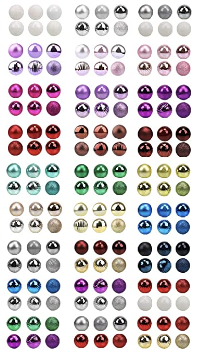 장식볼 만으로 저렴하게 트리를 채울 수 있어 미니멀한 트리가 아니라면 필수인 오너먼트입니다. 옛날에는 크리스마스 하면 대표하는 베이직한 레드, 그린, 골드, 실버 정도만 있었다면 요즘에는 정말 다양한 색으로 출시가 되어서 디자인하기가 훨씬 자유롭고 재밌어졌어요. 크기 또한 장식볼은 테이블에 올려두는 미니 트리에 장식되는 2cm부터 대형 트리에 들어가는 30cm까지 다채로워졌고요.