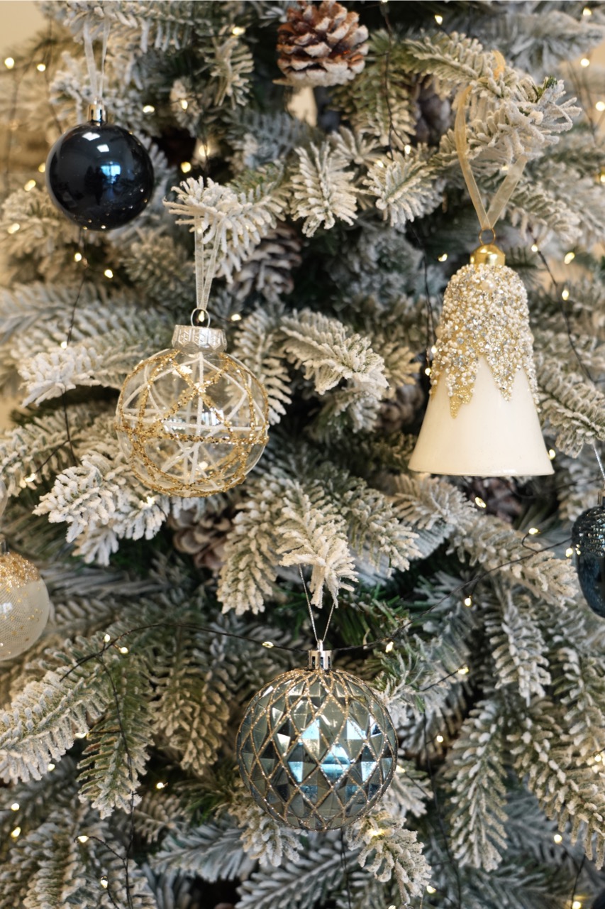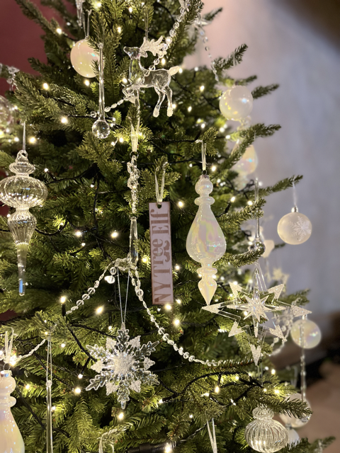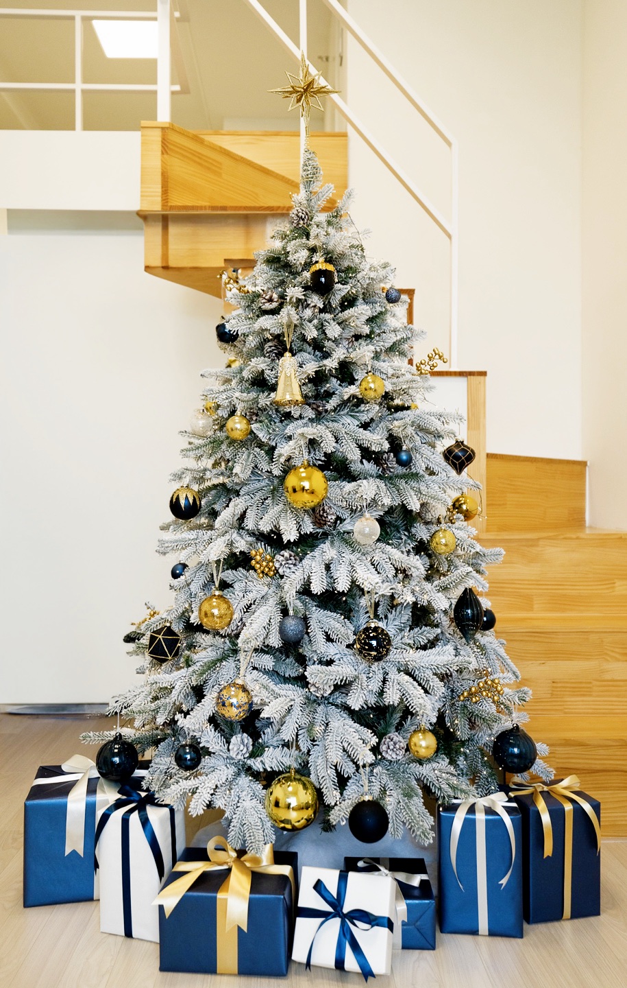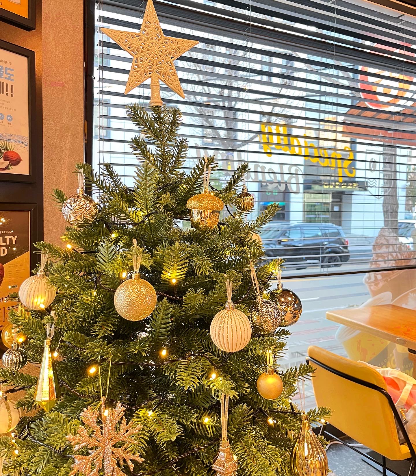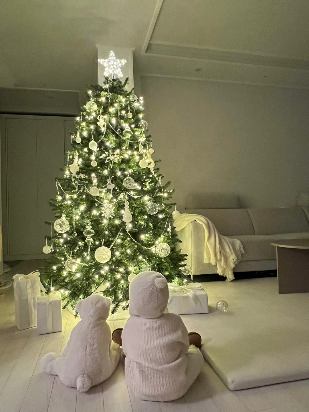 다양한 디자인의 유리 오너먼트와 장식볼, 열매 등이 조화롭게 들어가 있고요. 사진 속 전구는 촤르르 지네전구인데 LED 전구로도 변경가능합니다. 혹시 스노우 트리가 차가운 느낌을 많이 주지 않을까 고민하시는 분들은 자신 있게 말씀드립니다! 고요한 밤은 따뜻한 골드가 많이 들어가 있어서 오히려 따뜻하고 고급스러운 느낌이 상당히 강합니다.